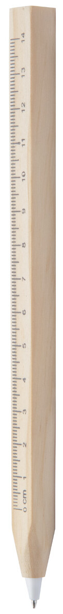 Dřevěné čtveraté kuličkové pero s 14 cm pravítkem na jedné straně, s modrou náplní.