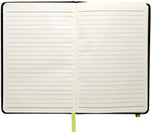Texturovaný blok A5, potažený PU kůží se záložkou, gumičkou a držákem pera. 96 linkovaných listů.