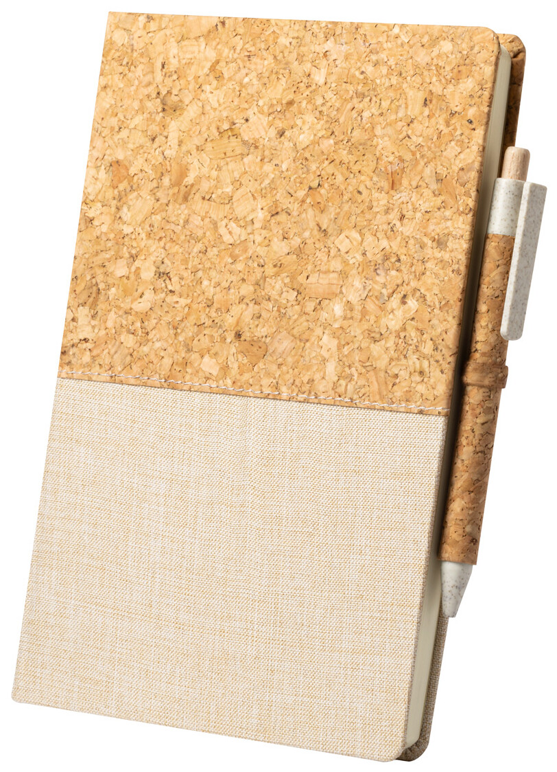 Blok A5 s deskami z přírodního korku a bavlny a 80 čistými listy. Vč. kuličkového pera z korku a pšeničné slámy, s černou náplní.