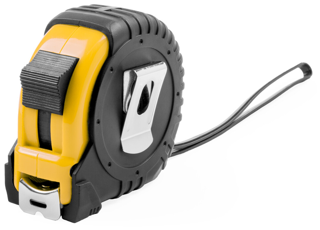 Plastový svinovací metr s aretací, kovovým klipem a páskem, 7,5m.