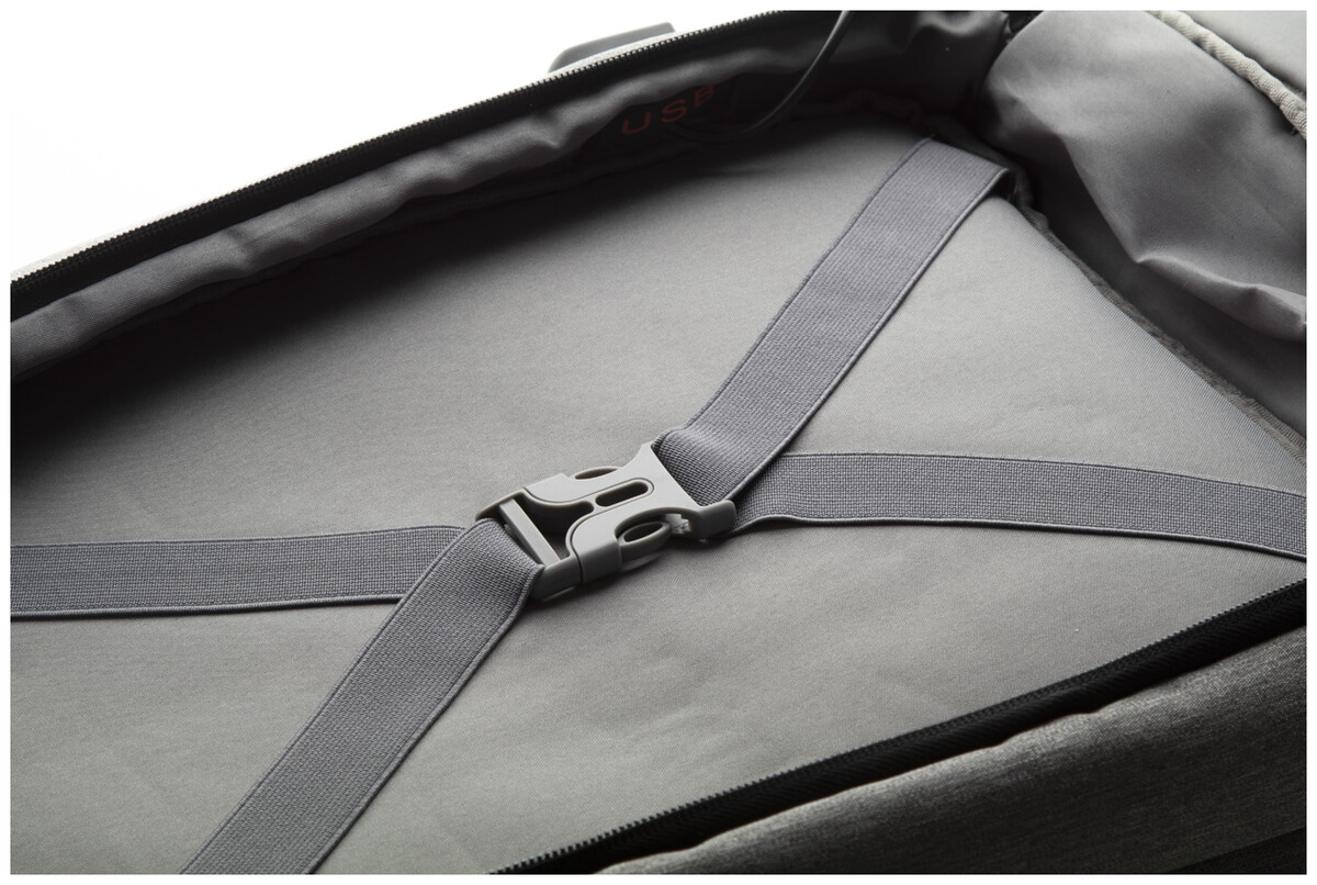 Batoh s více přihrádkami na zip, vnitřními kapsami polstrovaným prostorem pro notebook (15 ") a tablet, ergonomickými zády a s ramenním popruhem. S popruhem na vozík a vestavěným USB připojením pro power banky. 400D polyester.