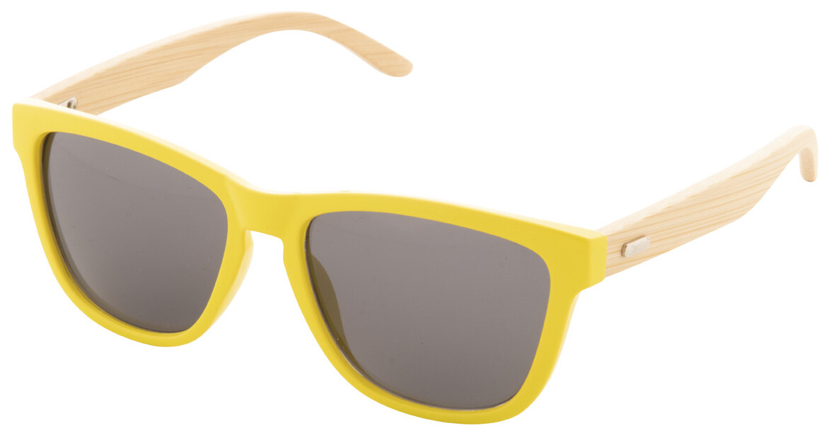 Sluneční brýle s barevnými plastovými obroučkami a bambusovými nožičkami. S ochranou UV 400.