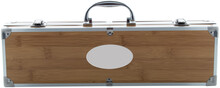 Sada na grilování z nerez oceli a s bambusovou rukojetí (vidlička, kleště a obracečka s otvírákem na lahve). S bambusovým vzorem v hliníkovém pouzdře.