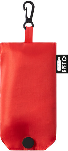 Skládací nákupní taška z RPET polyesteru, s etiketou s označením RPET.