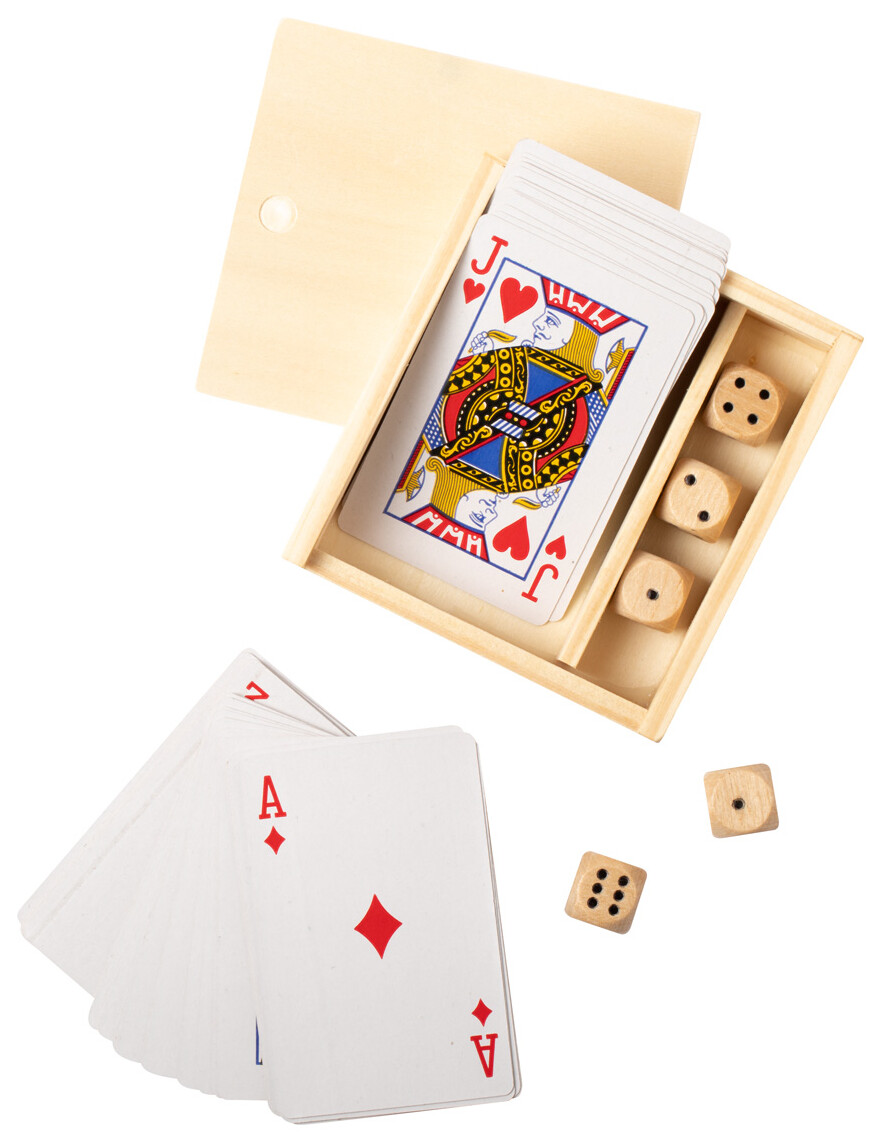 Sada her v dřevěné krabičce - francouzské hrací karty a 5 kostek.