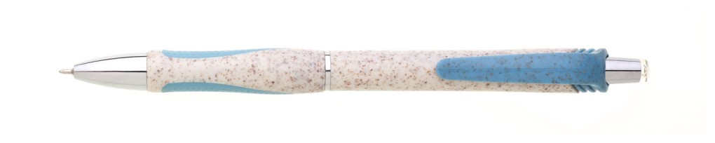 Propiska s plastem s podílem pšeničné slámy v přírodní barvy se světle modrým klipem a barevným gumovým úchopem. Náplň X20, hrot 0,5mm.