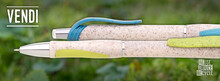 Propiska s plastem s podílem pšeničné slámy v přírodní barvy se světle zeleným klipem a barevným gumovým úchopem. Náplň X20, hrot 0,5mm.