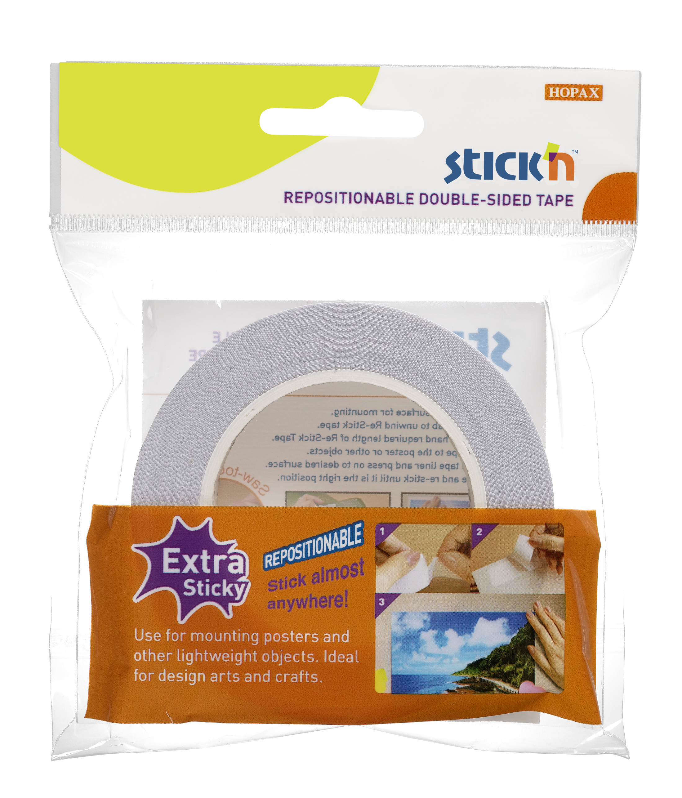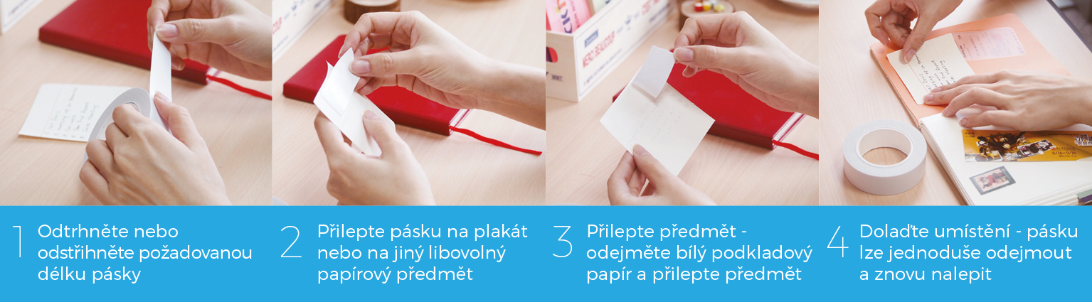 Silně lepicí oboustranná samolepicí páska s možností opakovaného použití je vhodná pro připevnění plakátů, fotografií a aranžování. Umožňuje pevné a zároveň odnímatelné uchycení.