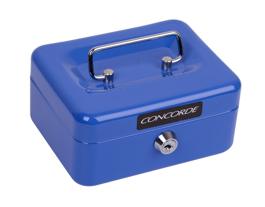 Kovová pokladna vyrobená z bezešvého ocelového plechu, přihrádka na mince, uzamykatelná, přenosná. 150 x 120 x 71 mm, barva: modrá.