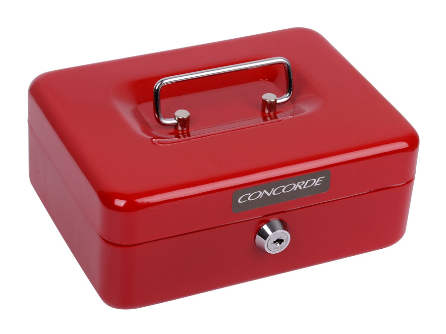 Kovová pokladna vyrobená z bezešvého ocelového plechu, přihrádka na mince, uzamykatelná, přenosná. 195 x 145 x 75 mm, barva: červená.