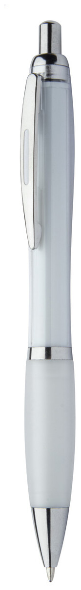 Plastové kuličkové pero s průhledným tělem, úchopem v odpovídající barvě a lesklými chromovanými částmi. S modrou náplní.