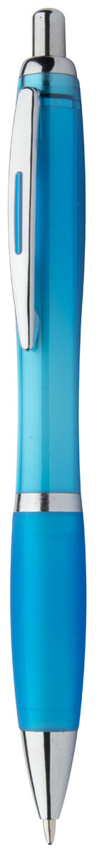 Plastové kuličkové pero s průhledným tělem, úchopem v odpovídající barvě a lesklými chromovanými částmi. S modrou náplní.