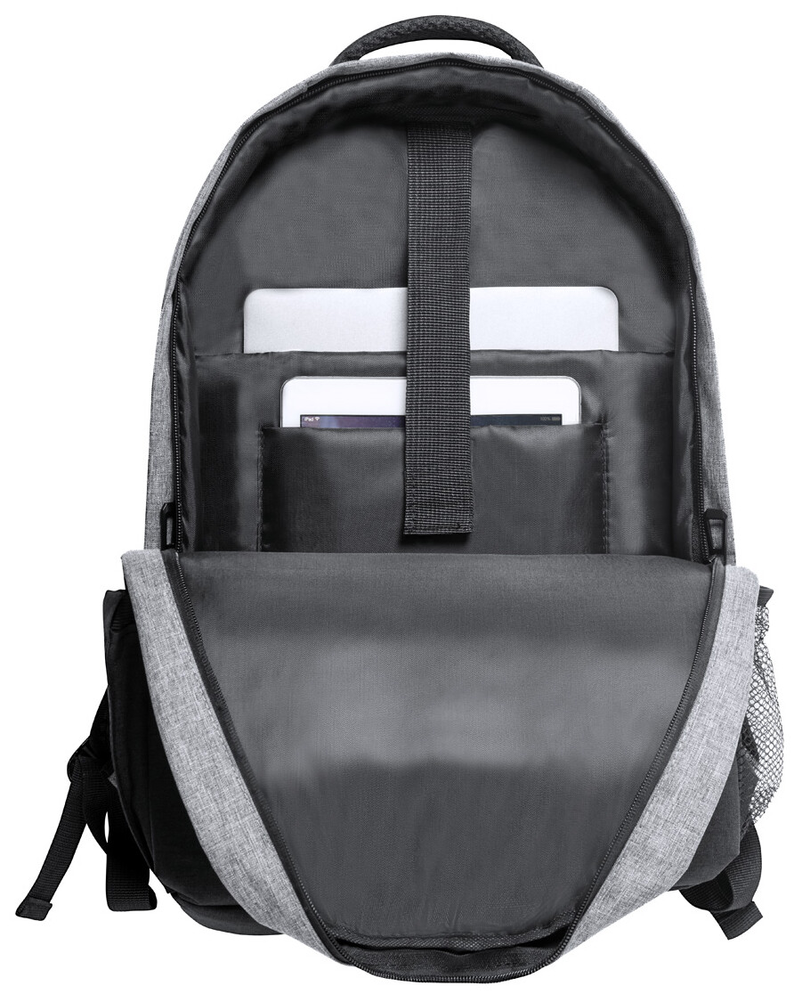 Dvoubarevný batoh RPET s hlavní kapsou na zip, polstrovanou přihrádkou na notebook (15 ") a tablet (10"), postranními kapsami, polstrovanými zády a ramenními popruhy. 600D RPET polyester.