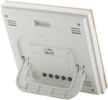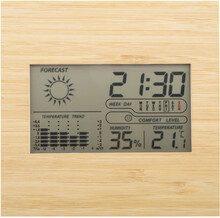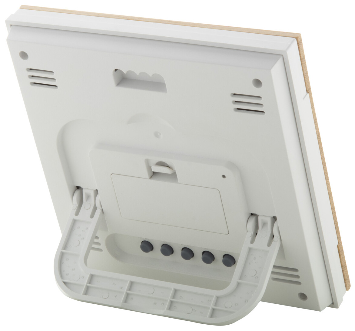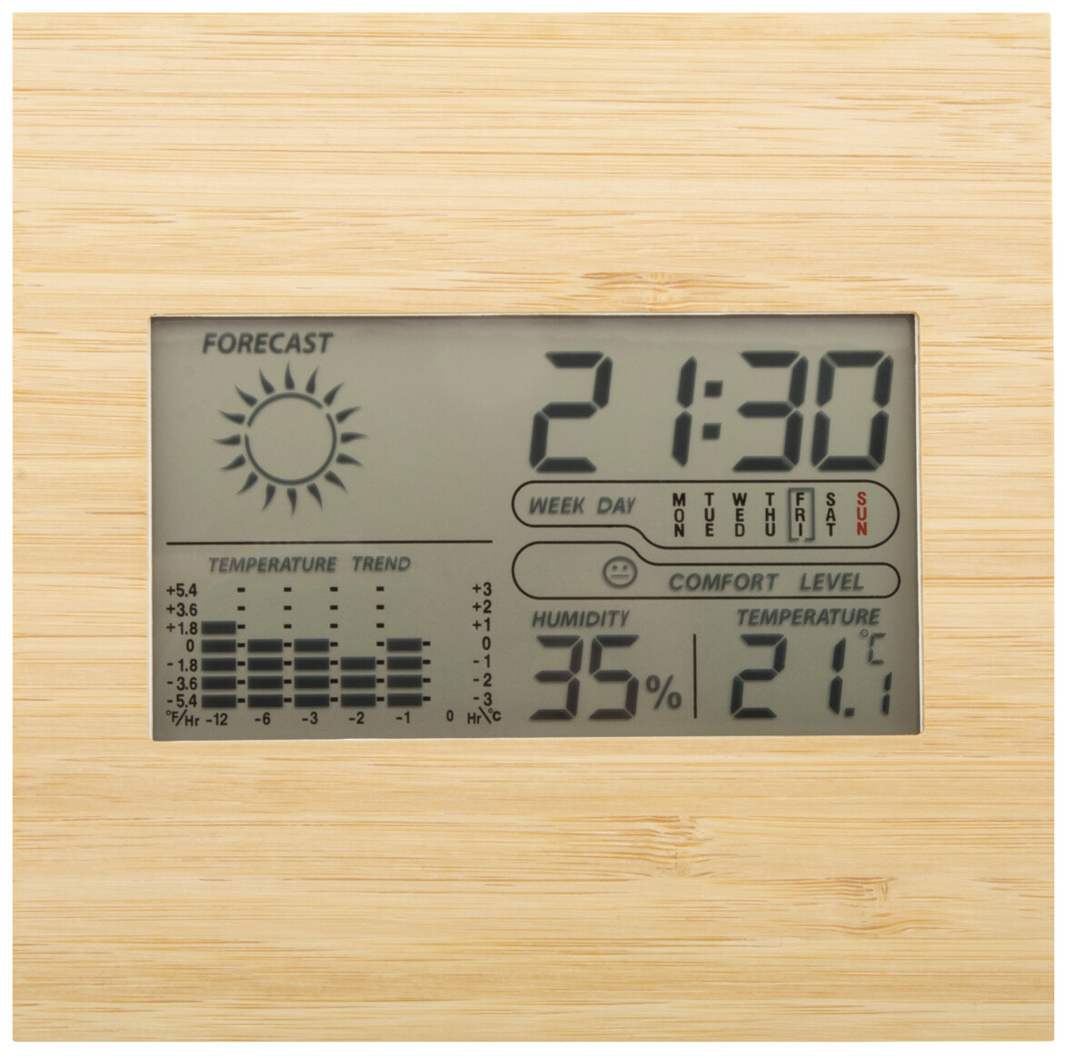Meteorologická stanice a digitální hodiny s bambusovým předním panelem. Funkce: budík, kalendář, teploměr, zobrazení vlhkosti a paměť teploty. Pracuje se 2 bateriemi AAA, dodáváno bez baterií.