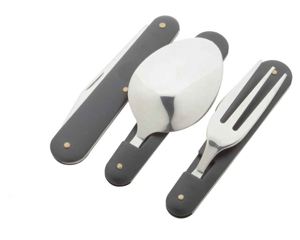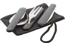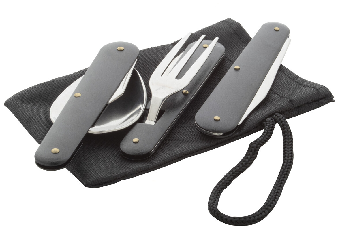Skládací kempingová příborová sada z nerezové oceli s hliníkovými držadly, 300D polyester. Včetně vidličky, nože a lžíce. V černém obalu.