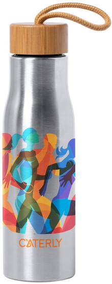 Láhev z nerezové oceli s bambusovým uzávěrem a popruhem, 550 ml.