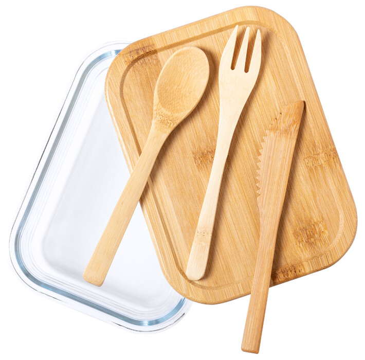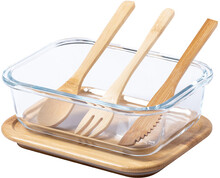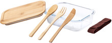 Skleněný box na jídlo s víkem z přírodního bambusu. Se sadou příborů z bambusu (nůž, vidlička a lžíce) a elastickým páskem, 500 ml.