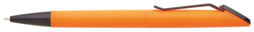 Plastová otočná propiska ARESTA v neonově oranžové barvě s černou špičkou a černým kovovým klipem. Na držák klipu je možné umístit epoxy samolepku. Náplň velkoobsahová, modře píšící.