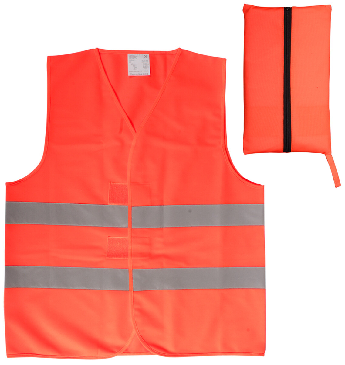 Vysoce viditelná vesta v pouzdru na zip, splňující evropskou normu EN ISO 20471 Class 2.