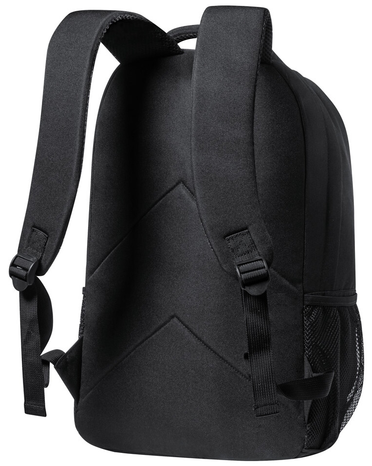 Batoh RPET s přihrádkami na zip, bočními kapsami ze síťoviny, elastickými šňůrkami vpředu, polstrovanou přihrádkou na notebook (15") a tablet (12"), polstrovaná záda a ramenní popruhy. S výrazným štítkem RPET. Polyester 600D RPET.