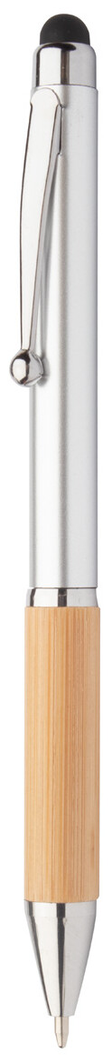 Plastové otočné kuličkové a dotykové pero s bambusovým úchopem, kovovým tělem a lesklými chromovanými částmi. S modrou náplní.