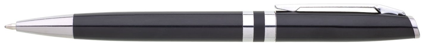 Varianta klasické propisky černé tělo je zdobené dvěma chromovými kroužky. Otočný mechanismus, náplň modře píšící.