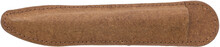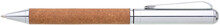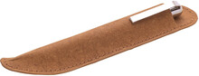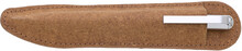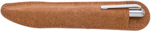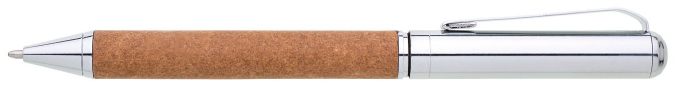 Otočná kovová propiska, úchopová část zdobena recyklovanou kůží, ze které je vyrobeno i pouzdro na propisku.