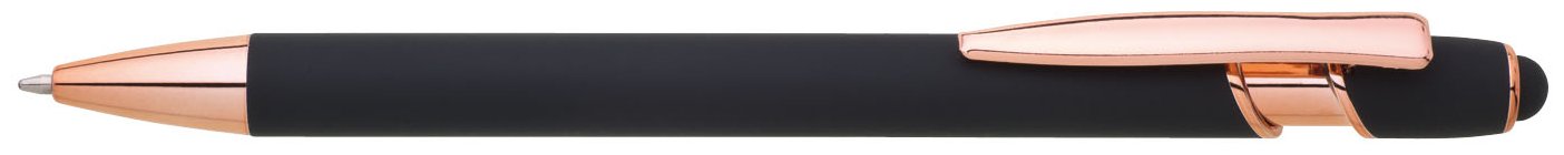 Kovová propiska se soft povrchem, touch koncovkou a doplňky v růžovo-zlaté barvě. Laserované logo je lesklé, růžovo-zlaté. Náplň modře píšící.