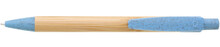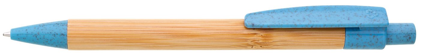 Bambusové tělo propisky s doplňky z plastu s podílem slámy. Náplň modře píšící velkoobsahová.
