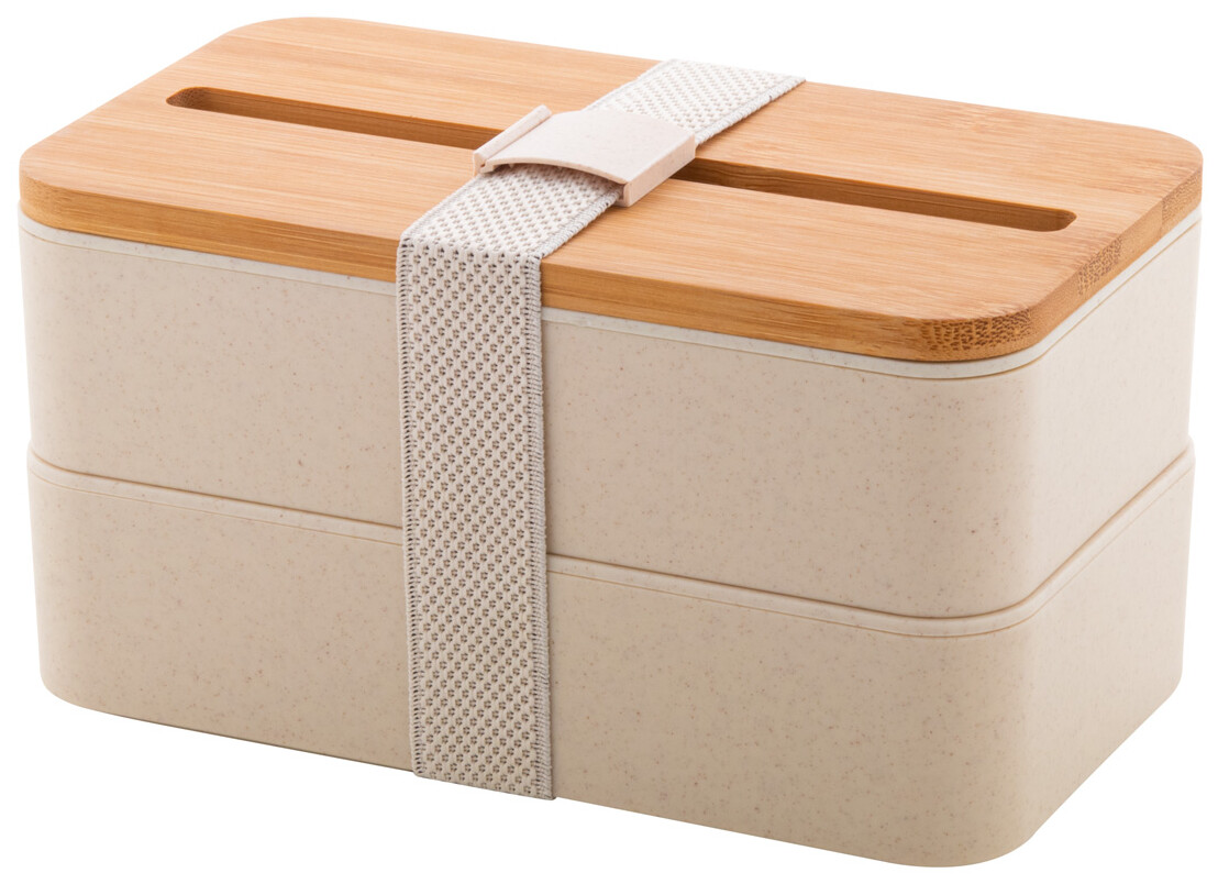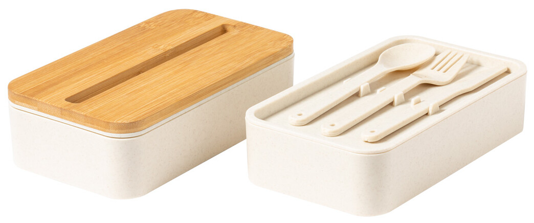 Box na jídlo z PP plastu se sadou příborů (vidlička, lžíce a nůž), bambusovým víkem s držákem na mobilní telefon a elastickým popruhem. Se 2 přihrádkami o objemu 700 ml.