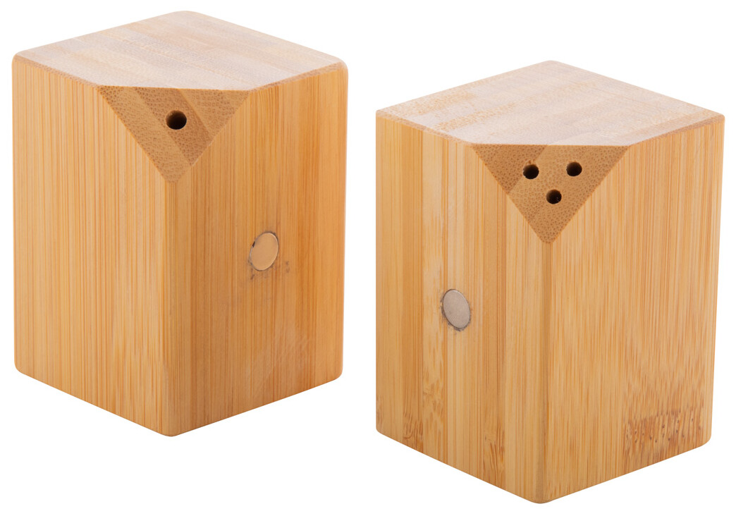 Sada 2 ks bambusové solničky a pepřenky. Sada je spojena ve středu díky magnetům umístěným na straně.