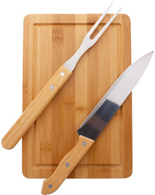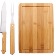 Bambusová sada na krájení masa s bambusovým prkénkem, nerezovou vidličkou a nožem s bambusovými rukojeťmi.