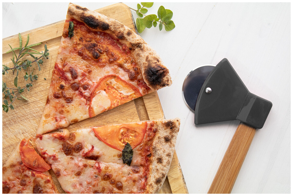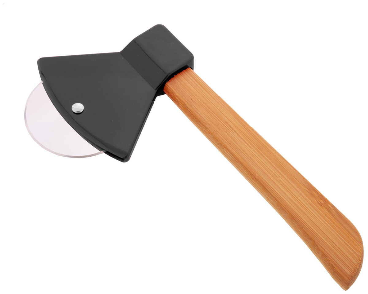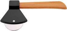 Kráječ na pizzu ve tvaru sekery s bambusovou rukojetí a čepelí z nerezové oceli.