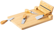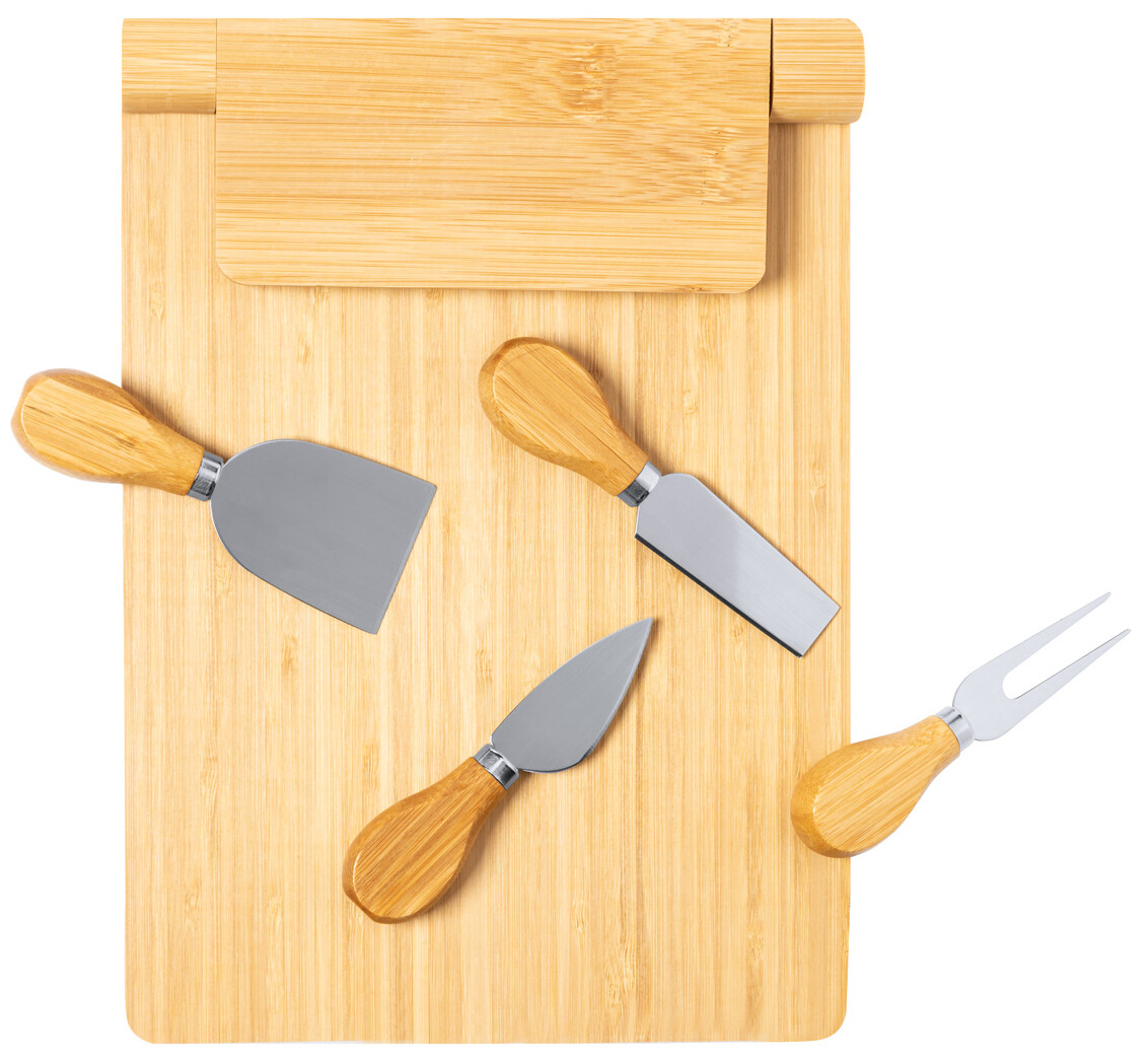 Bambusové prkénko se sadou 4 kusů nerezových nožů na sýr na skládacím magnetickém držáku.