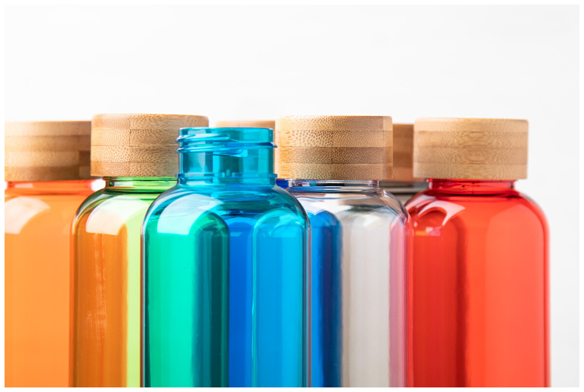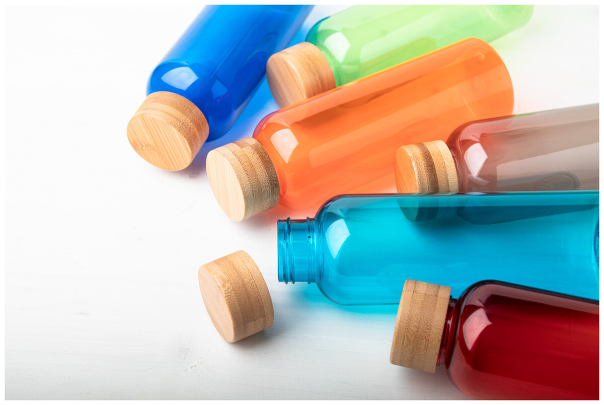 Láhev RPET s bambusovým víčkem, 500 ml. Bez BPA. Nevhodné pro sycené nápoje.