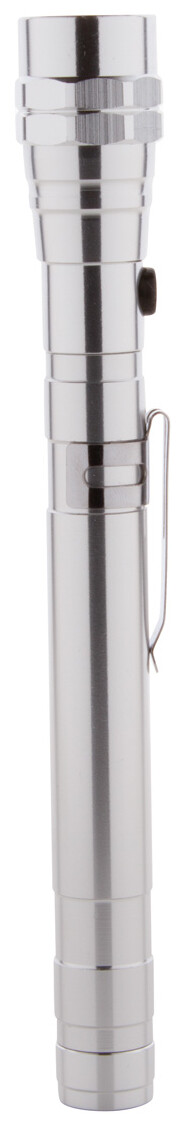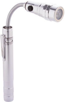 3 LED hliníková svítilna s výsuvnou a flexibilní hlavou, magnetem nahoře a kovovou boční sponou. Včetně knoflíkových baterií. Max. délka: 57 cm.