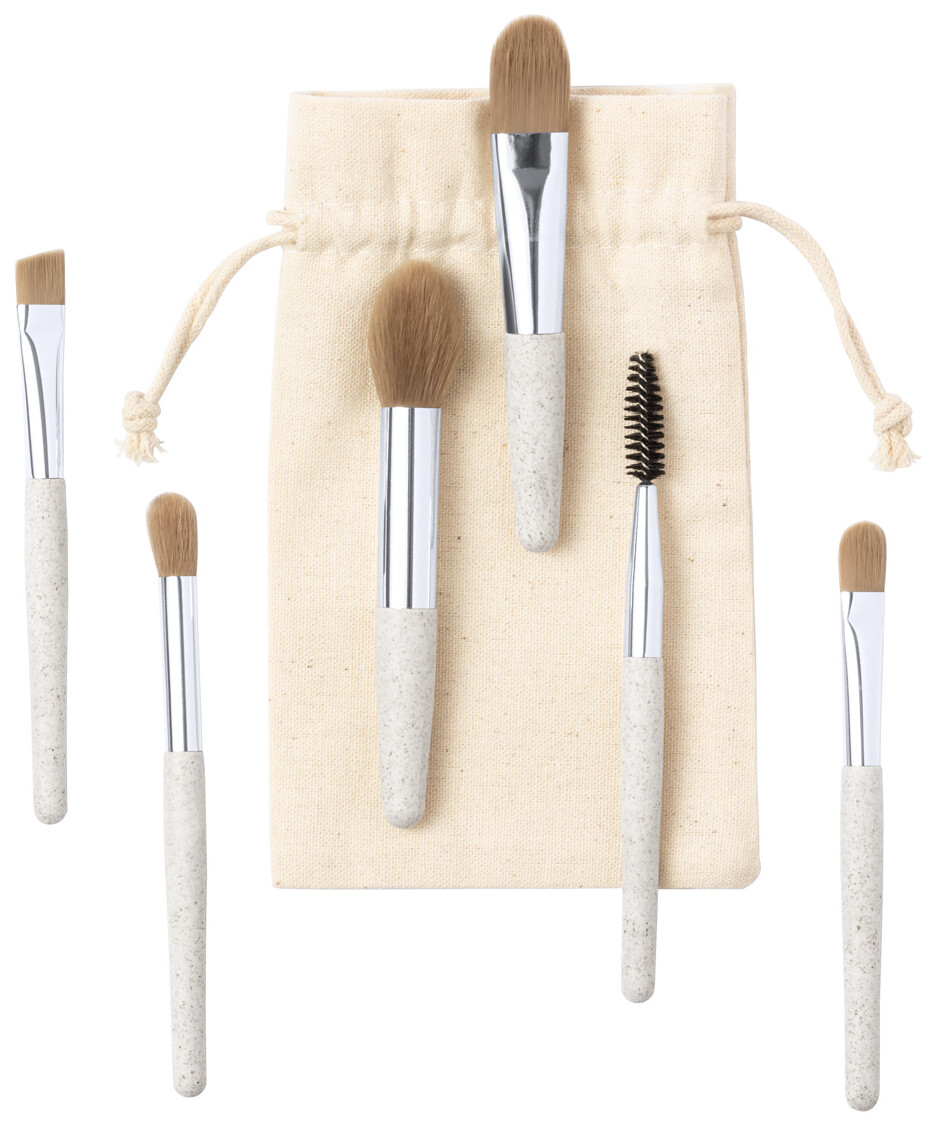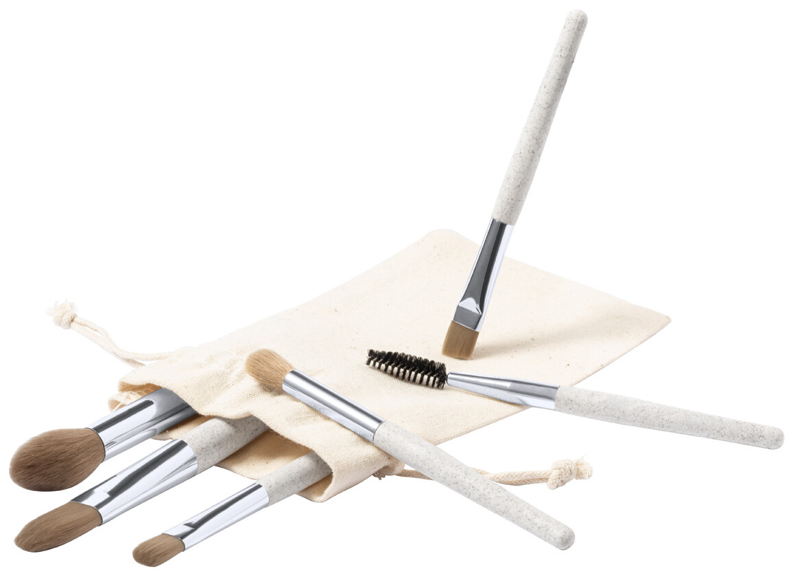 6dílná sada štětečků na make-up z ekologické pšeničné slámy a PP plastu, v bavlněném pytlíku se stahovací šňůrkou.