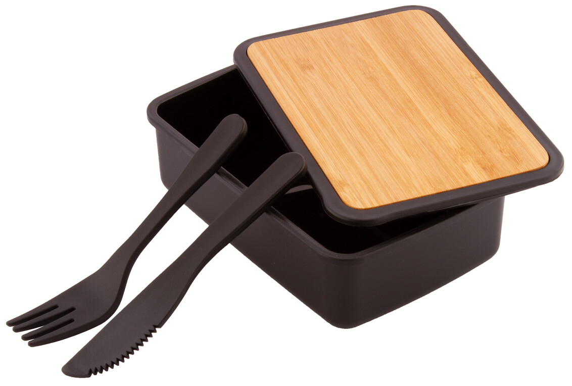 Box na jídlo z recyklovaného PP plastu s bambusovým víkem, sadou příborů (nůž a vidlička) a elastickým páskem. 500 ml.