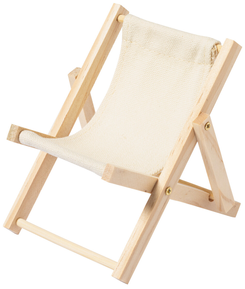 Stojánek na mobilní telefon ve tvaru skládacího lehátka ze dřeva a bavlny.