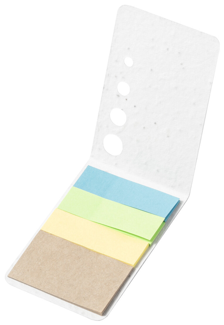 Blok z recyklovaného papíru potažený papírem se semínky s 10 samolepícími lístky a 30 značkovači stránek (ve 3 různých barvách). Obal papíru se semínky obsahuje semena petúnie v různých barvách, která lze zasadit oddělením obalu od poznámkového bloku.