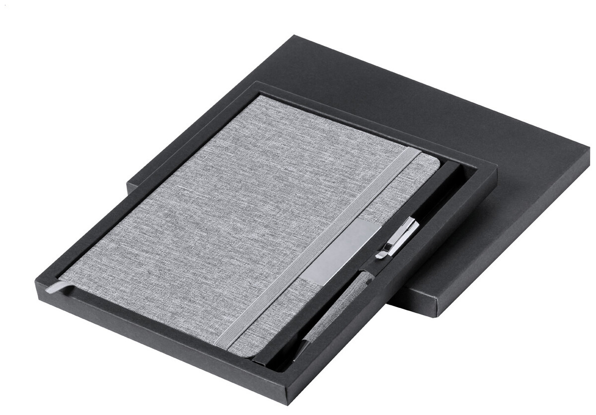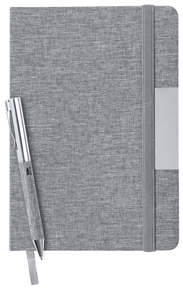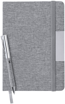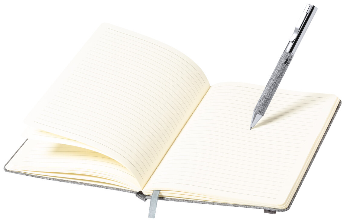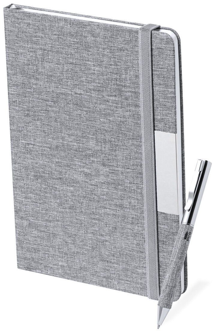 Blok A5 s deskami potaženými polyesterem 300D RPET se 100 linkovanými listy a gumičkou. Včetně kovového kuličkového pera potaženého polyesterem RPET s modrou náplní.