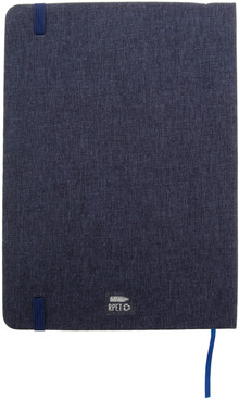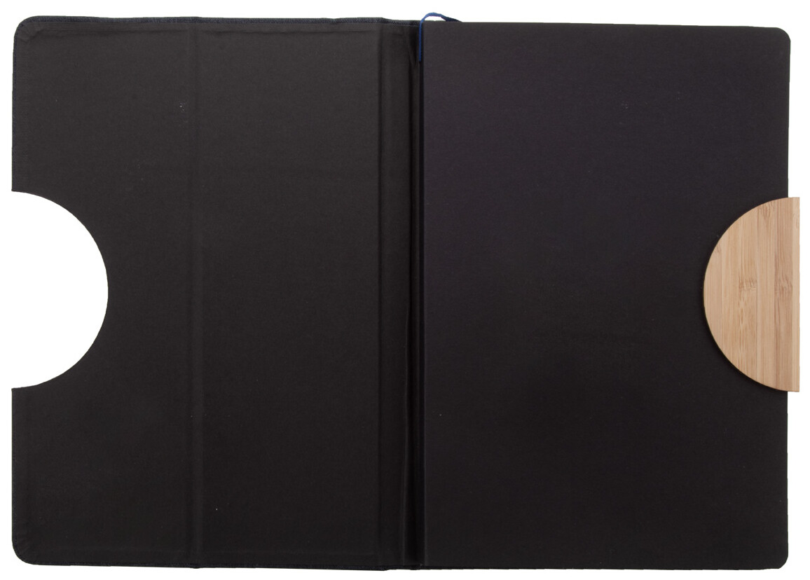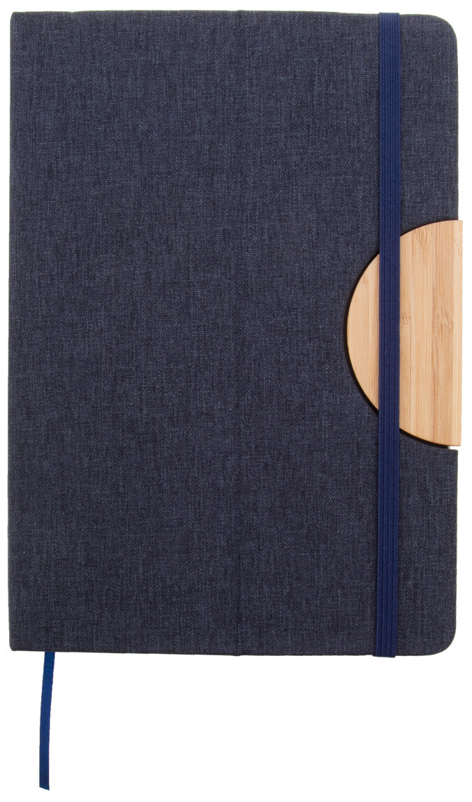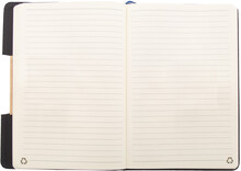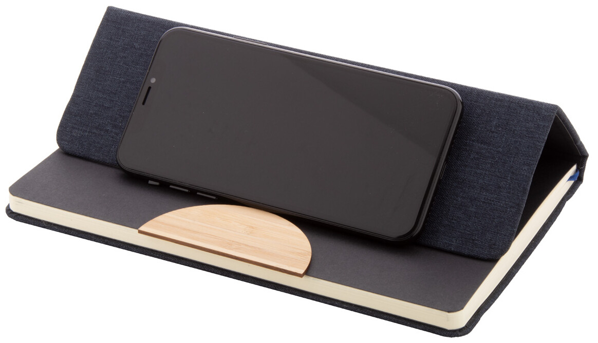 Blok A5 s deskami potaženými polyesterem RPET s bambusovou vložkou a funkcí držáku na mobil. S 80 linkovanými listy z recyklovaného papíru, záložkou a gumičkou.