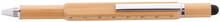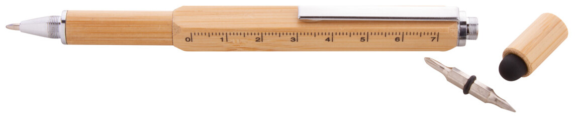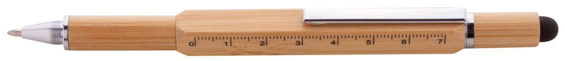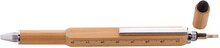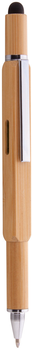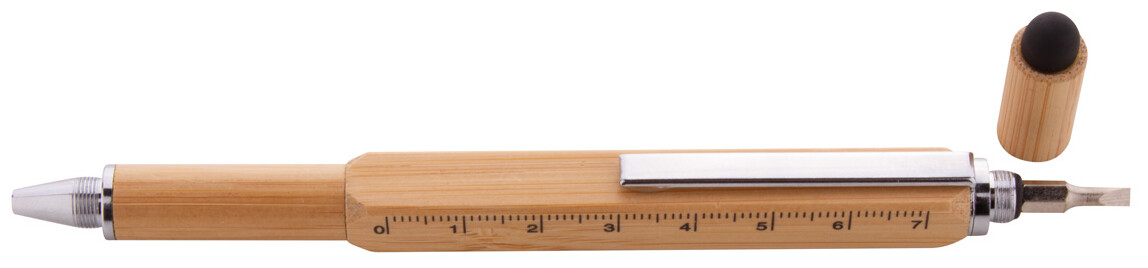 Multifunkční otočné kuličkové a dotykové pero z bambusu. S oboustranným šroubovákem, vodováhou a pravítkem 7 cm. S modrou náplní.