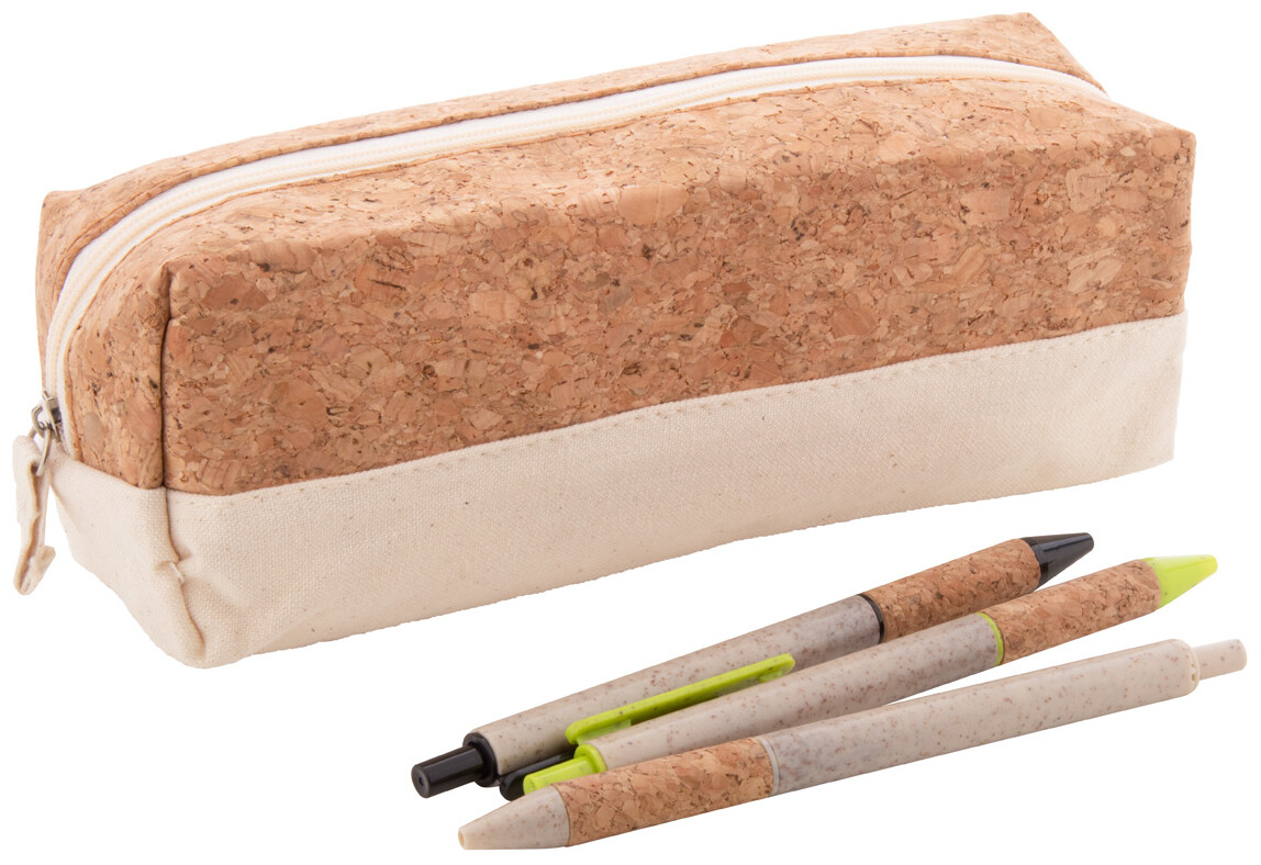 Pouzdro na pera na zip z přírodního korku a bavlny s barevně odpovídajícím bavlněným zipem.