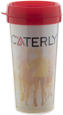 Plastový dvouvrstvý termo hrnek s otvorem na pití ve víčku. Logo lze umístit mezi stěny hrnku. Baleno v bílé papírové krabičce. Objem 450 ml.
