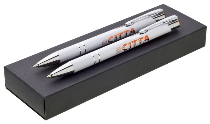 Sada kovové hliníkové propisky a mikrotužky s bílým povrchem a barevným lesklým laserem v barvě horního ukončení propisky. Tělo zdobené dvěma stříbrnými proužky. Sada je nabízena v černé papírové krabičce PORE.