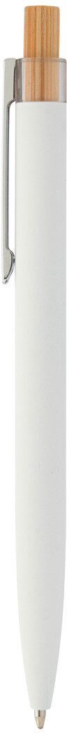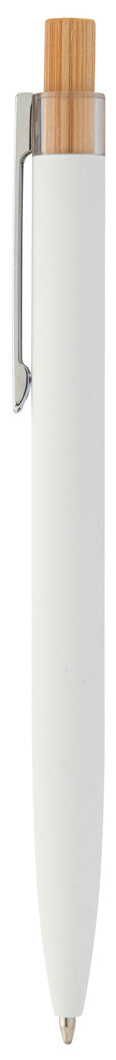 Kuličkové pero z recyklovaného hliníku s pogumovaným povrchem, bambusovým tlačítkem a chromovým klipem. Se speciální vrstvou pro zrcadlové laserové gravírování. S modrou náplní.