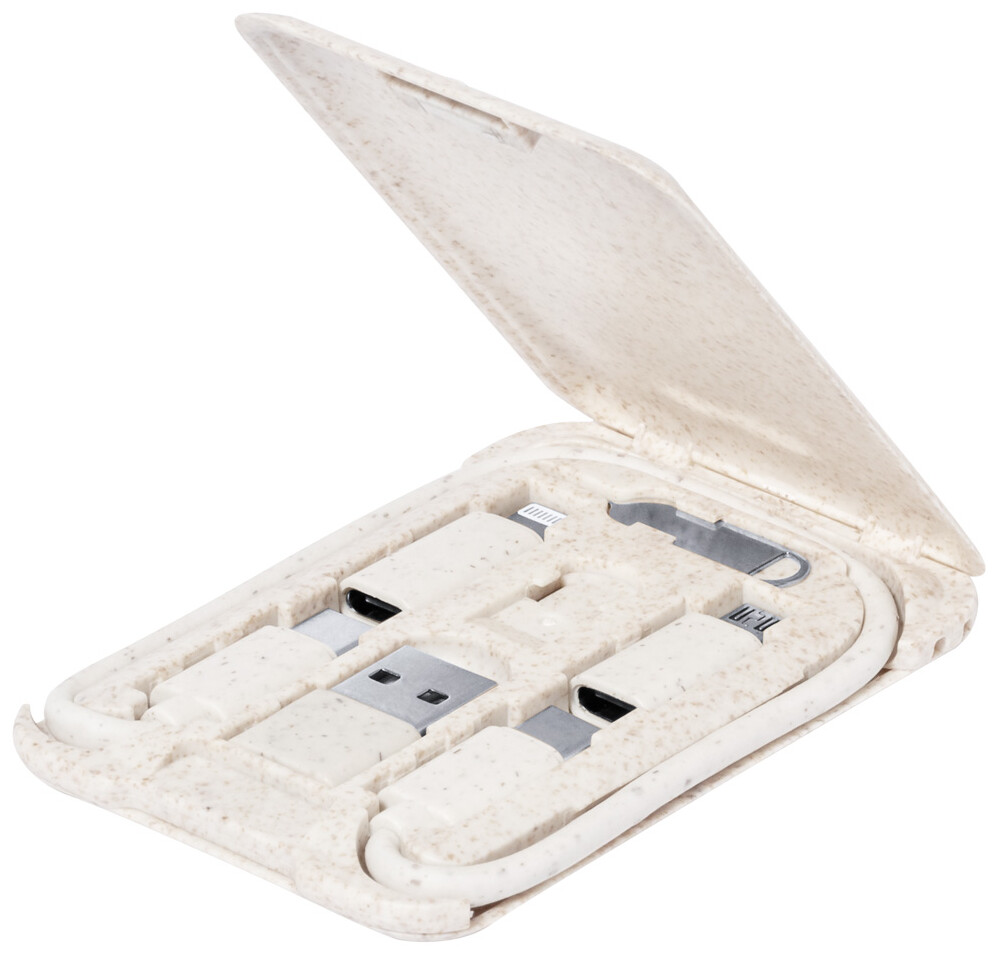 Sada USB nabíjecího kabelu v ekologickém plastovém pouzdře z pšeničné slámy s funkcí držáku na mobil. S vysunovačem SIM karty a konektory micro USB, USB-C a Lightning. Se vstupy USB a USB-C.