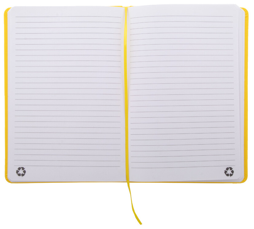 Blok potažený recyklovanou PU kůží se 100 linkovanými listy z recyklovaného papíru. Se záložkou v odpovídající barvě a gumičkou. Velikost A5.