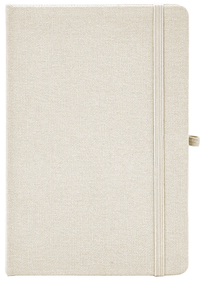 Blok potažený recyklovanou bavlnou s 80 linkovanými listy z recyklovaného papíru. Se záložkou v odpovídající barvě, gumičkou a držákem na pero. Velikost A5.